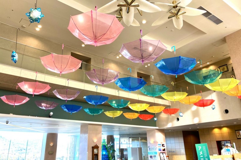 2階ロビーに虹色のアンブレラスカイを設置しました。