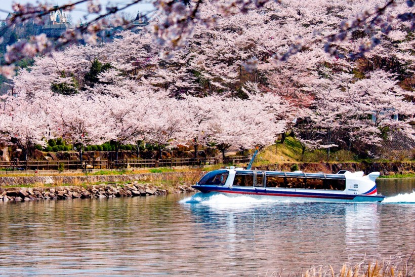 雄大な恵那峡の景色とともに、約400本のソメイヨシノが咲き誇る光景はまさに圧巻!